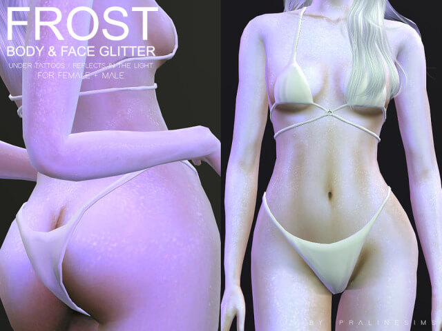 FROST Body & Face Glitter Reflecting glitter, under tattoos, you can combine all 3 slots for more intense shimmer. For female and male sims.