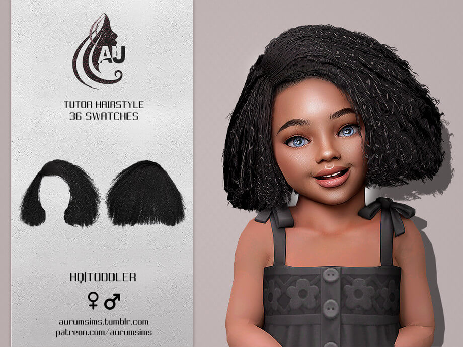 Tutor – Curly hairstyle for toddlers Curly hairstyle in 36 swatches for all toddlers by Aurum for The Sims 4 Base game compatible Female and male frames 36 swatches (naturals, unnaturals, ombre) All LODs Hat compatible HQ compatible Smooth weights Custom thumbnail Has some transparent issues